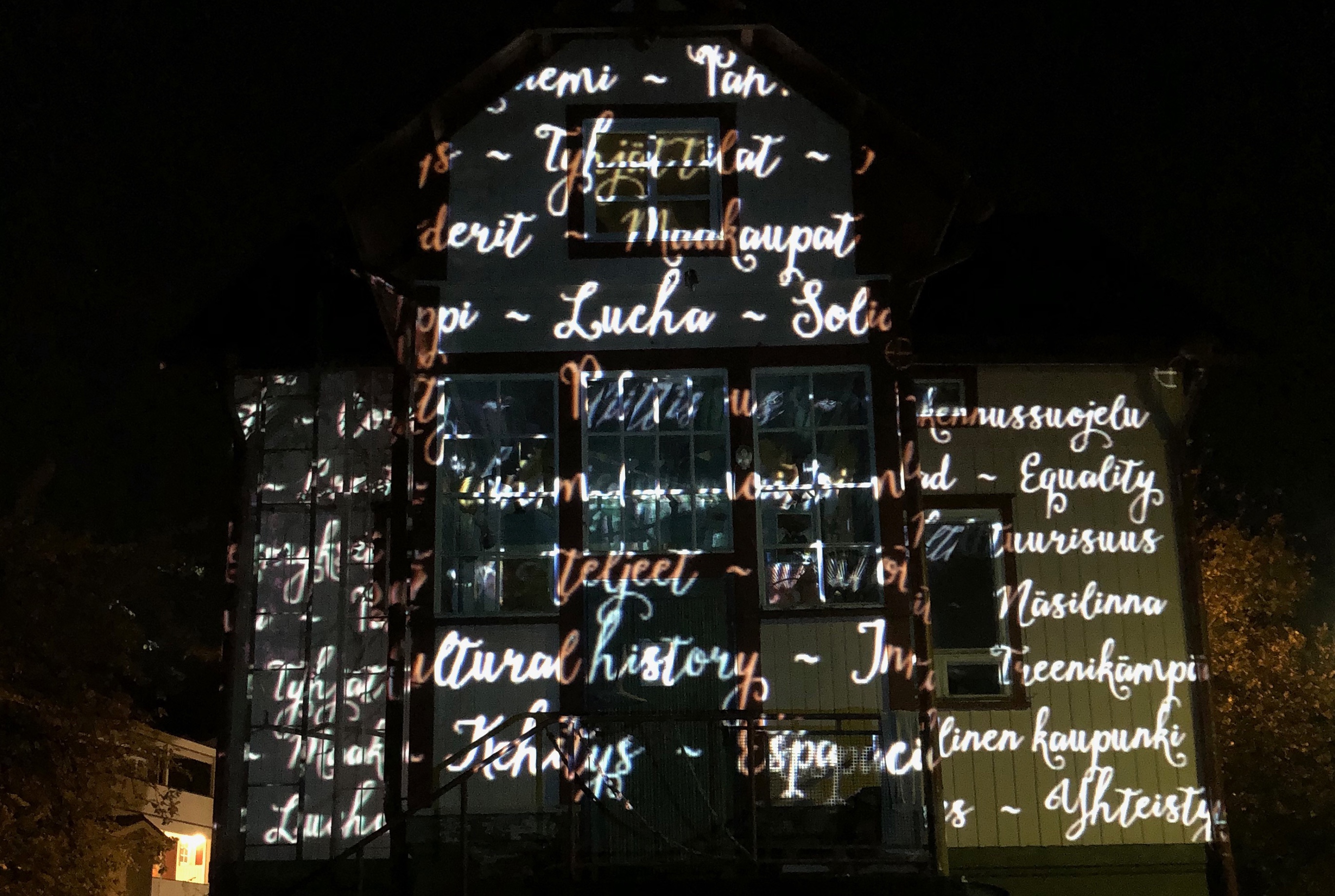 Projection mapping project aim was to show the connection of the art centre with the new artists, emerging art techniques and boost the visibility of the local artist's community. Hirvitalo is the place where artists and enthusiasts are gathering together, exhibit works and share new ideas. The community of the local artists trying to keep this centre up and running, thus another goal of the project was to show that this community is open to new ideas and experiments from the outside are more than welcome.